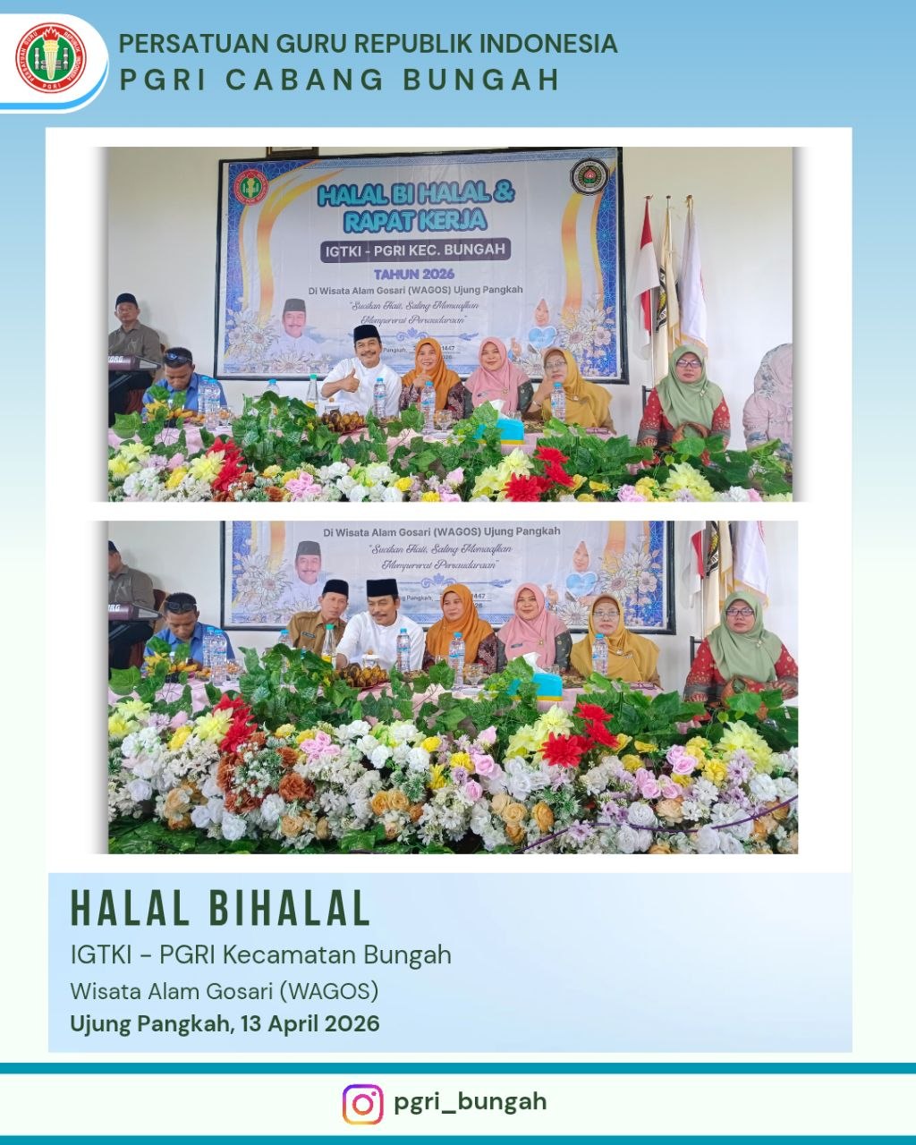 Kegiatan Halal Bihalal yang diselenggarakan oleh IGTKI–PGRI Kecamatan Bungah berlangsung dengan penuh kehangatan dan kebersamaan pada Senin, 13 April 2026. Bertempat di Wisata Alam Gosari (WAGOS), acara ini dihadiri oleh para guru Taman Kanak-Kanak (TK), pengurus organisasi, serta tamu undangan. Kegiatan diawali dengan registrasi peserta dan dilanjutkan dengan pembukaan, pembacaan ayat suci Al-Qur’an, serta sambutan...Read More